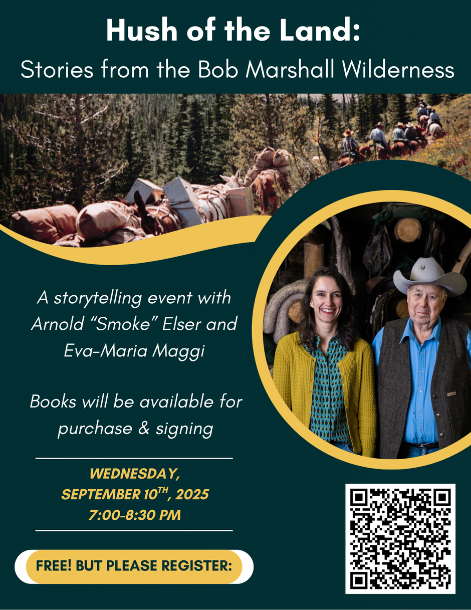 Smoke and I will be reading from our forthcoming book "Hush of the Land : A Lifetime in the Bob Marshall Wilderness" (Bison Books, 2023/24). This inspirational adventure memoir chronicles the six-decade quest of packer and outfitter Arnold “Smoke” Elser to protect wild lands by bringing thousands of people deep into the mountains of Western Montana on horseback. With limited financial means and still in college, the young man from Ohio decides against a promising career in Forestry, and chooses to share his love of Wilderness with city dwellers as a professional Outfitter; a passion that ultimately enables him to live a life others dream of and protect the land he loves. Based on hundreds of hours of oral history, the book tells the captivating story of his early days as a packer in the Bob Marshall Wilderness and Bitterroot Mountains. Share the joys of summer rides, the thrill of hunting camp, harrowing Grizzly bear encounters on high mountain tops, unpassable snow drifts, unearth dwellings of long past frontiersmen and native American heritage, fly-fish clear mountain streams, and spend many nights around a warm camp fire exploring the history and unique value of the last wild lands of the West.